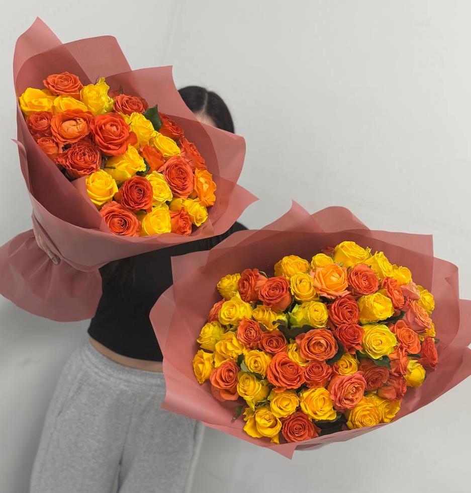 Внимание! На фото представлен образец. В букете используются розы разного цвета в схожей цветовой гамме с образцом.