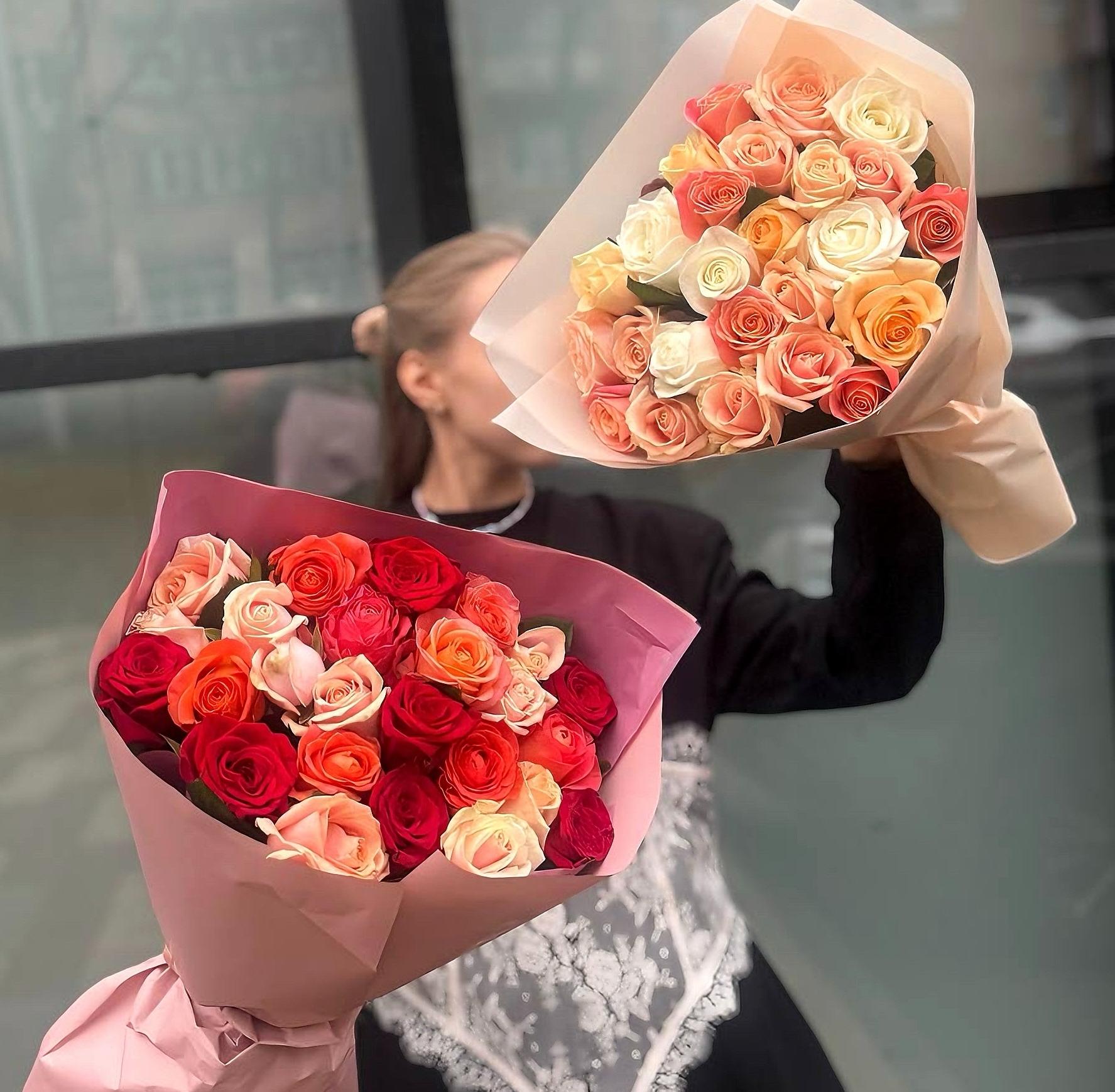 Внимание! На фото представлен образец. В букете используются розы разного цвета в схожей цветовой гамме с образцом.