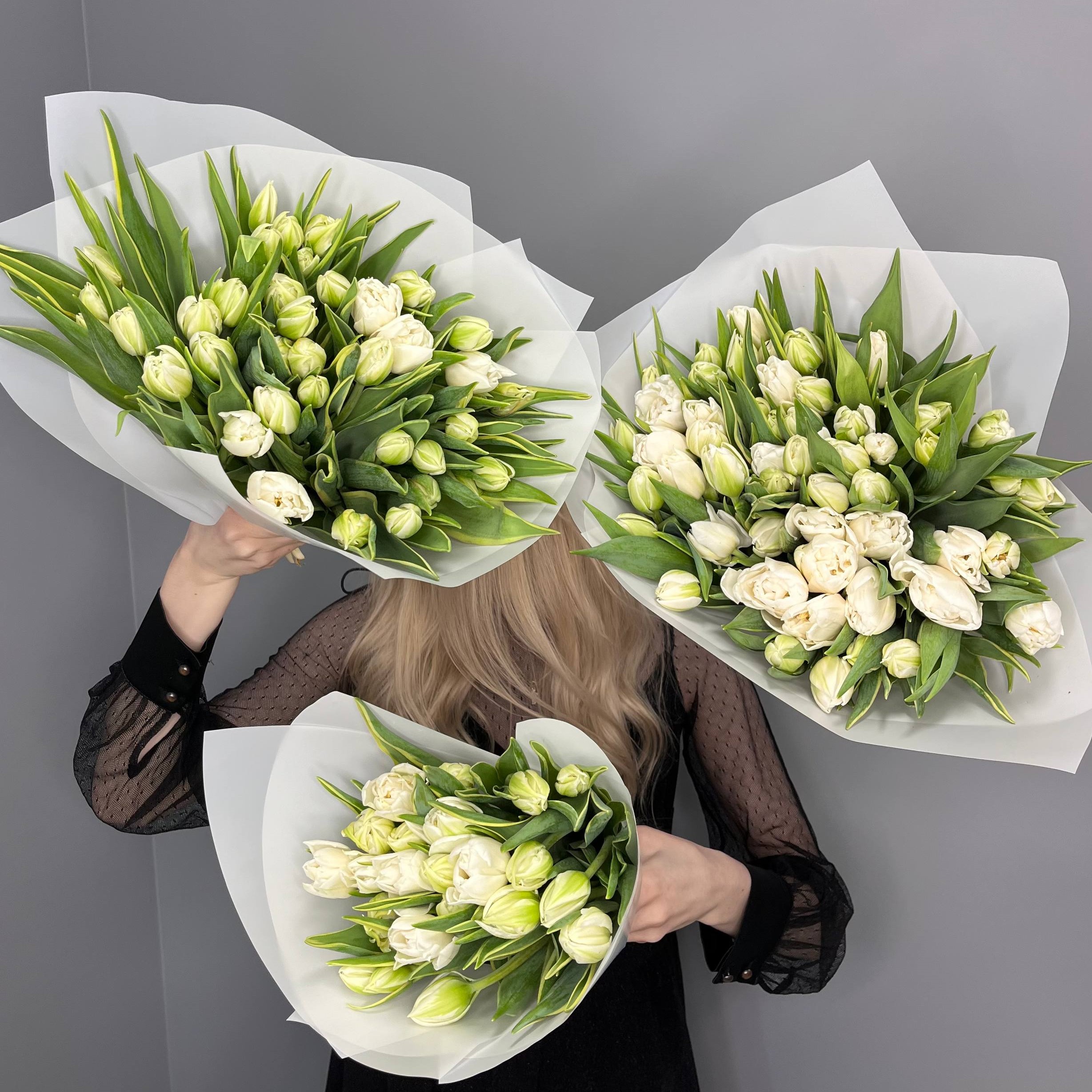 35 белых пионовидных тюльпанов