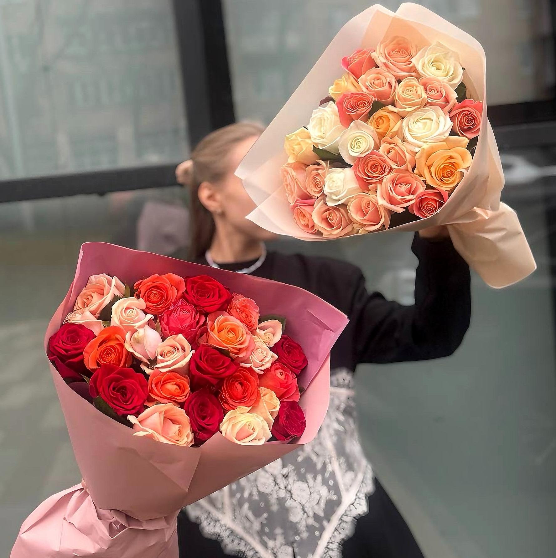 Внимание! На фото представлен образец. В букете используются розы разного цвета в схожей цветовой гамме с образцом.
