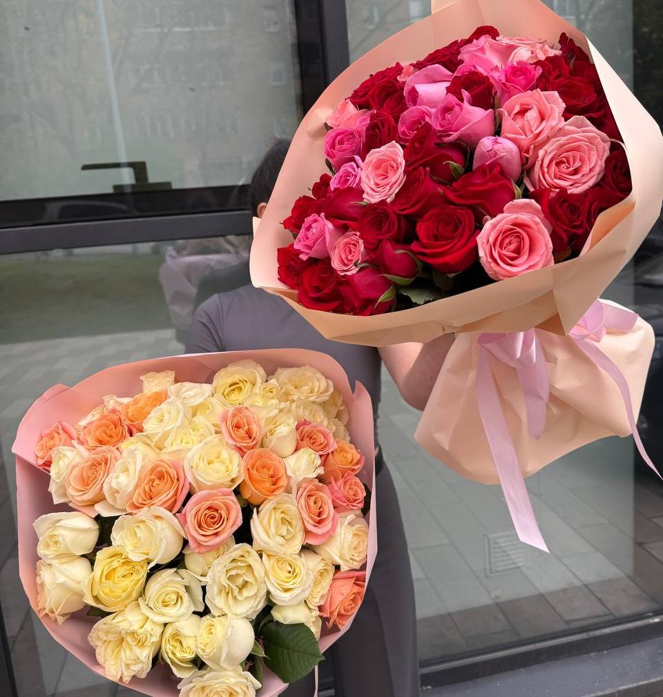 Внимание! На фото представлен образец. В букете используются розы разного цвета в схожей цветовой гамме с образцом.