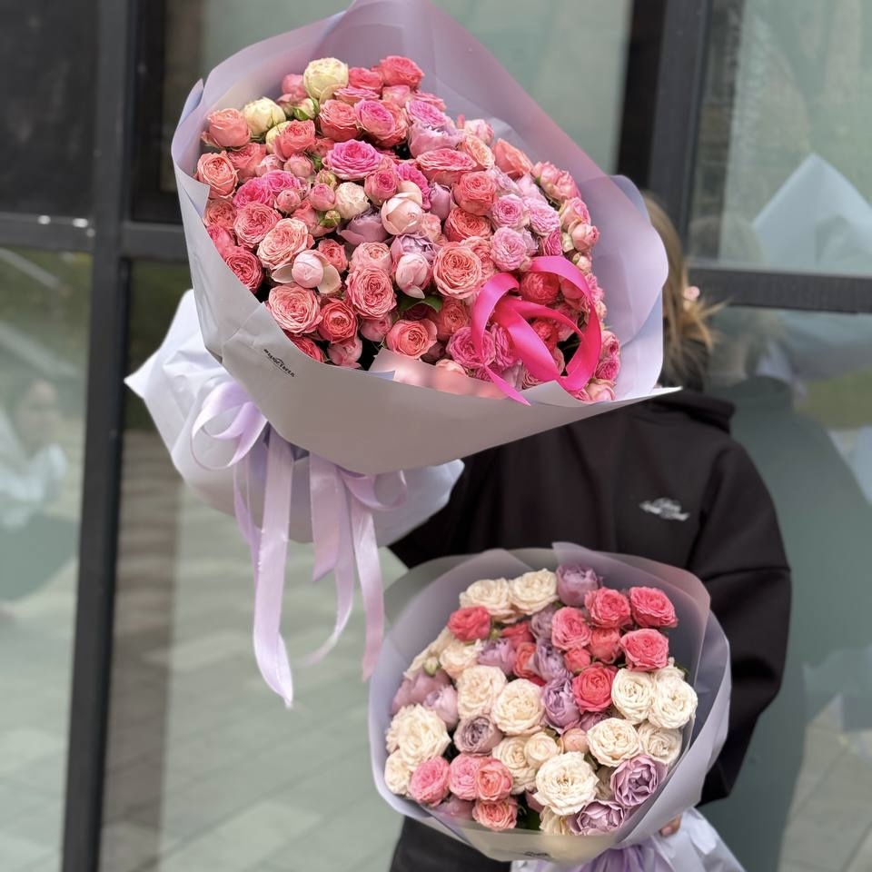 Внимание! На фото представлен образец. В букете используются розы разного цвета в схожей цветовой гамме с образцом.