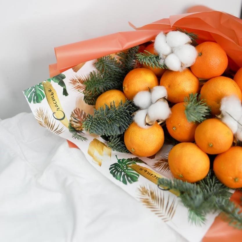 Новогодний букет из нобилиса, хлопка и мандаринов (15 шт)