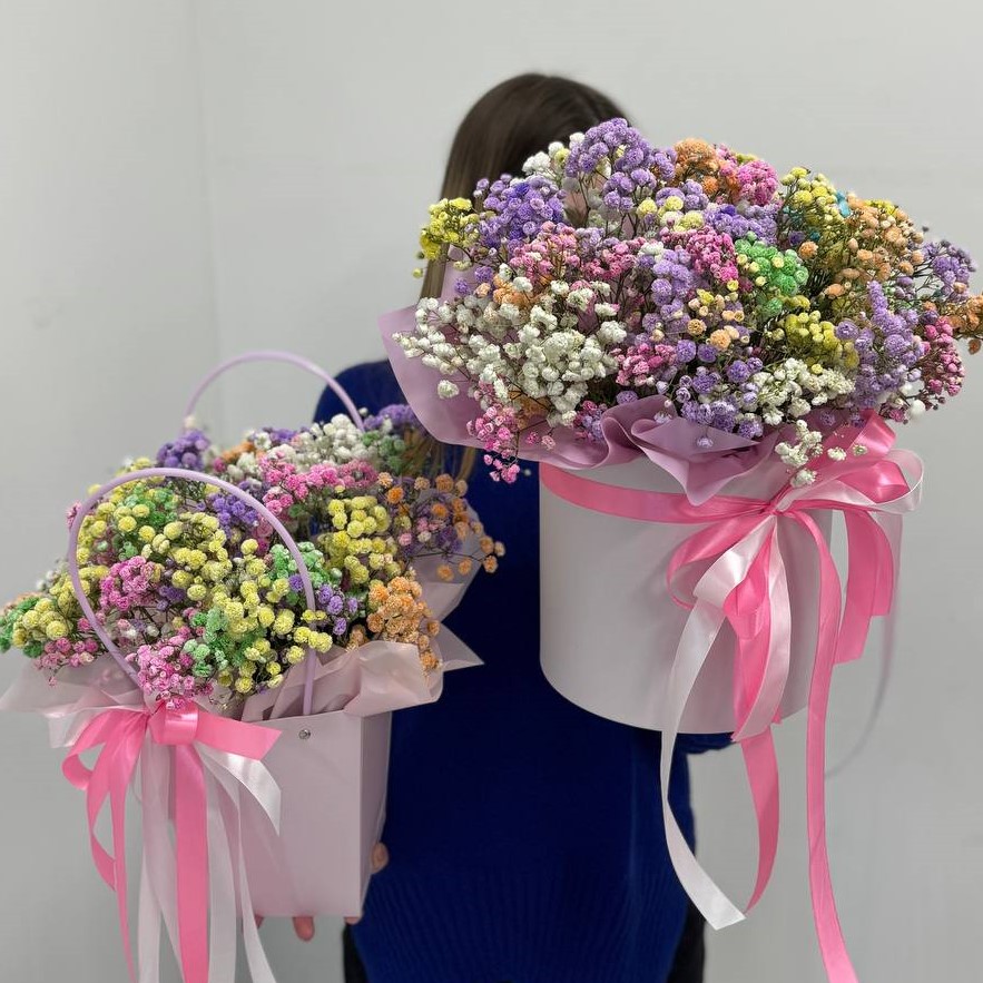 Композиция из радужной гипсофилы в коробке